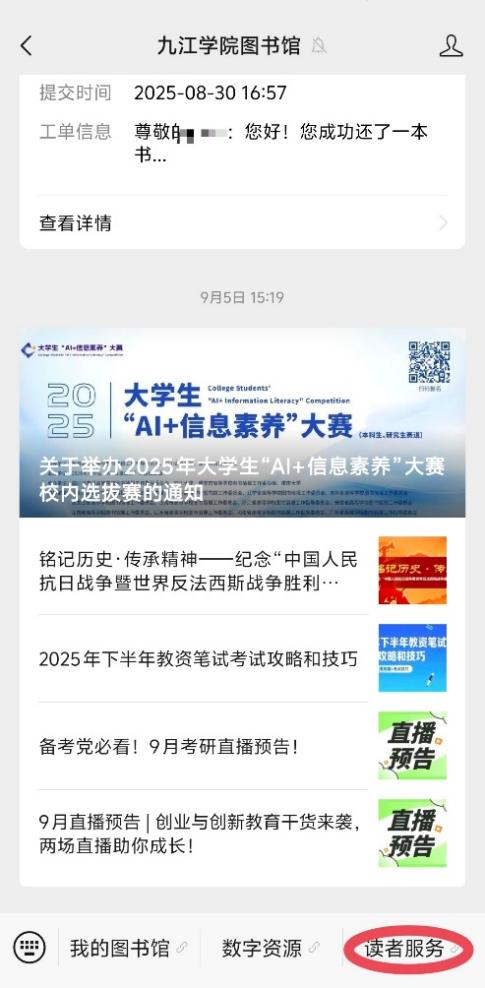关注“九江学院图书馆”微信公众号(账号“jjxy_tsg”),点击右下角“读者服务——入馆教育”进入游戏闯关页面。