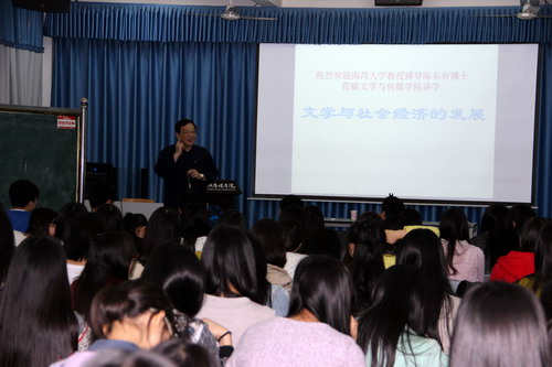 4月23日上午,文友楼203教室座无虚席。应文传学院邀请,江西省委宣传部前常务副部长、南昌大学博导陈东有教授来到文传学院,作了题为“文学与社会经济的发展”的专题报告。文传学院党委书记汤红莲出席报告会。文传学院汉语言文学、语文教育等相关专业师生100余人聆听报告。报告会由文传学院副院长江腊生博士主持。
