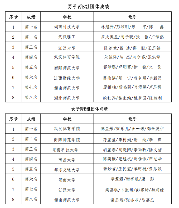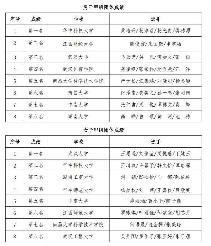 华中科技大学获得甲组男子团体冠军,武汉大学获得甲组女子团体冠军,湖南科技大学获得丙B组男子团体冠军,武汉体育学院获得丙B组女子团体冠军。武汉理工大学、九江学院、武汉体育学院、武汉大学、南昌大学、中南大学获得体育道德风尚奖。