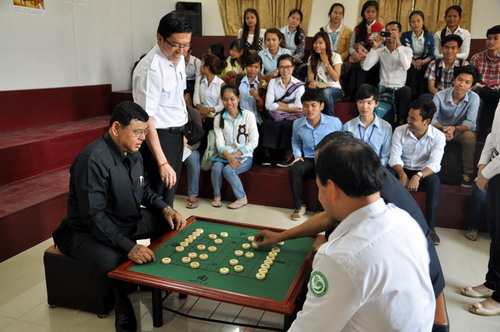 谢莫尼勒首先代表孔子学院对两位将军拨冗参加中国象棋大赛决赛表示感谢。他说,中国象棋是中国文化集中体现的一项体育活动,希望大家多多学习、积极参与。今天是孔子学院首届象棋大赛决赛,以后还会有第二届、第三届。他还用柬语为在场的学员介绍了中国象棋的棋道。