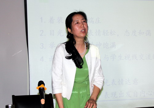 讲座中,喻老师首先通过她与学生间发生的几件趣事,收获了她在教书育人中的快乐,同时也深深地体会到作为一名教师、一名班主任的责任。接着喻国贞老师以自己一堂课的教案为例,阐述了教学设计中教学目标、教学对象、教材内容、教学策略、教学媒体、教学评价等各个环节的选择与筹划;在教学技能选择这一主题中她以大量亲身教学实例,诠释了在课堂教学中如何通过教学语言、非言语性行为、板书、提问等教学技能的运用,提高课堂教学效果。
