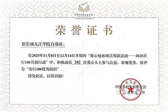 近日,2025年中国乡村发展基金会“善行100”月捐行动表彰大会圆满落幕。我校学生工作处(学生资助管理中心)指导的新长城九江学院自强社凭借突出的组织动员能力与扎实的公益实践,在全国高校公益社团中荣获全国第17名的优异成绩,充分展现了九江学院青年学子的责任担当与奉献精神。