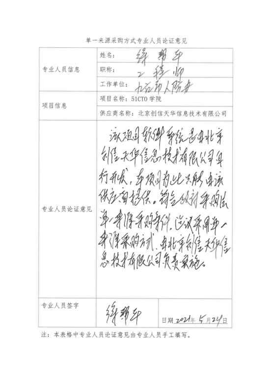 采用单一来源采购方式的原因及说明:北京创信天华信息技术有限公司是“51CTO学院”项目唯一授权供应商,符合政府采购单一来源情形,建议采用单一来源采购方式,由北京创信天华信息技术有限公司具体实施。